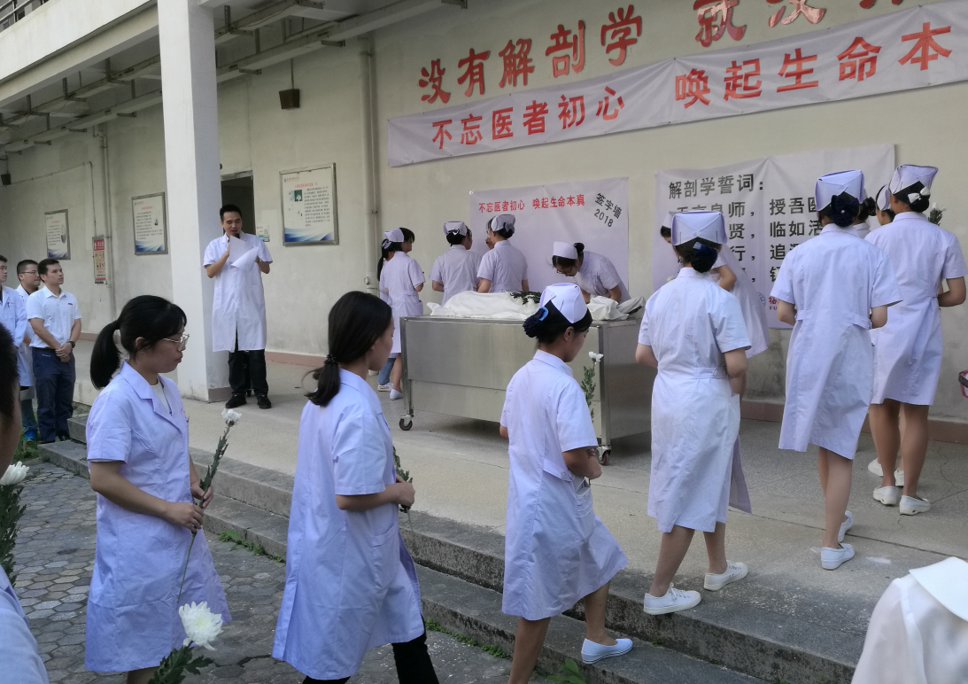 活動從生命教育的宣講開始,主持人陳戴和老師深情講述目前遺體捐贈的現(xiàn)狀,以及人體標(biāo)本在醫(yī)學(xué)教育中的重要作用,從而激發(fā)醫(yī)學(xué)生對遺體捐贈者及家屬的感激之情。隨后,葉榕老師帶領(lǐng)全體醫(yī)學(xué)生代表進(jìn)行解剖學(xué)誓詞宣誓,宣誓莊嚴(yán)而又神圣,“無言良師,授吾醫(yī)理;敬若先賢,臨如活體;謹(jǐn)言躬行,追深辨細(xì);德彰術(shù)精,錘成大醫(yī)”,響亮的宣誓聲在基礎(chǔ)部回蕩。接著,大家向大體老師深深鞠躬,敬獻(xiàn)菊花,并在活動簽字墻簽字留念。一朵朵潔白的菊花,表達(dá)了大家無盡的感恩與尊敬之情。一片片綠葉,正襯托出大體老師無私奉獻(xiàn)的大愛,永遠(yuǎn)在醫(yī)學(xué)生的心中煥發(fā)著生命的活力。