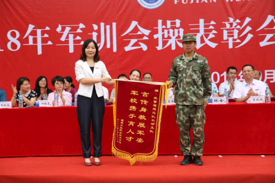 大會表彰了“軍訓(xùn)退役學(xué)生教官”8人,“優(yōu)秀軍訓(xùn)學(xué)員”577人,“軍訓(xùn)優(yōu)秀小隊”10個,“軍訓(xùn)內(nèi)務(wù)優(yōu)秀宿舍”35間。為表達對承訓(xùn)部隊的感謝,紀(jì)委書記李美華代表學(xué)院向武警福建總隊機動支隊贈送了“言傳身教展軍姿 軍校攜手育人才”的錦旗。