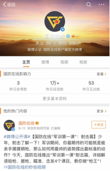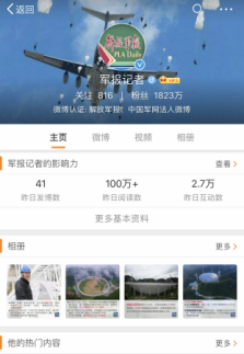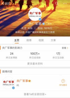 央廣軍事是中央人民廣播電臺(tái)軍事頻道的官方微博,有粉絲1076萬;軍報(bào)記者是《解放軍報(bào)》的法人微博,有粉絲1823萬,兩個(gè)微博的每日閱讀量均在100萬次以上。國(guó)防在線有粉絲8萬,由中央軍委國(guó)防動(dòng)員部與解放軍報(bào)社聯(lián)合主辦,是中國(guó)人民解放軍官方唯一在線軍訓(xùn)平臺(tái)。