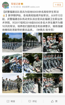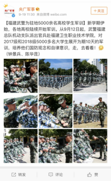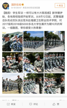9月12日至9月21日,學(xué)院2018年軍訓(xùn)工作圓滿完成,央廣軍事、軍報(bào)記者、國(guó)防在線等中央權(quán)威媒體在官方微博進(jìn)行了報(bào)道。