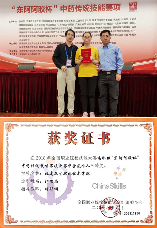 5月31日至6月1日,2018年全國(guó)職業(yè)院校技能大賽“東阿阿膠杯”中藥傳統(tǒng)技能賽項(xiàng)在山東中醫(yī)藥高等??茖W(xué)校舉行,共有來(lái)自全國(guó)27個(gè)省69所院校的115名選手參加本次大賽。我院藥學(xué)系15中藥301班江思思同學(xué)榮獲中藥傳統(tǒng)技能賽項(xiàng)個(gè)人三等獎(jiǎng)。