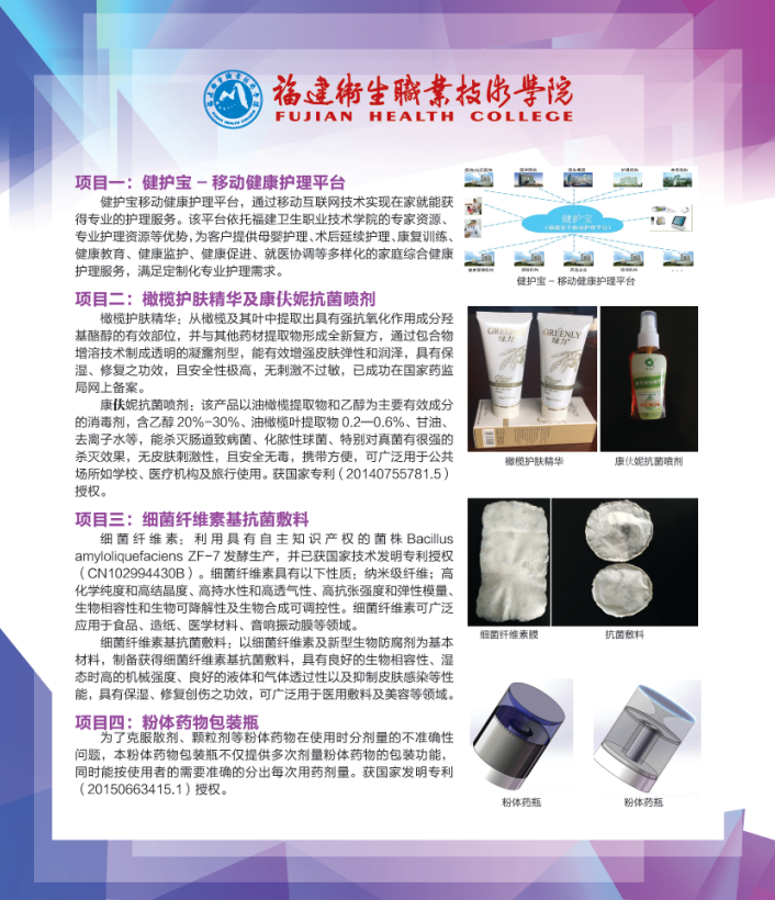 6月18日至21日,第十六屆中國?海峽項目成果交易會(簡稱6.18)在福州海峽國際會展中心舉行。此次高校成果展館設有福建省“雙一流”建設高校獨立展區(qū)、省外高校綜合展區(qū)、高校協(xié)同創(chuàng)新中心成果展區(qū)、優(yōu)秀青年博士展區(qū)、“互聯(lián)網+”展區(qū)、高等教育綜合展區(qū)、職業(yè)教育綜合展區(qū)等七大主題展區(qū),共有北京大學、清華大學等27所省外高校,廈門大學、福州大學等42所省內高校763項優(yōu)秀科技成果參展。在職業(yè)教育綜合展區(qū),我院組織了健護寶-移動健康護理平臺、細菌纖維素基抗菌敷料、橄欖護膚精華及康伕妮抗菌噴劑、粉體藥物包裝瓶等4個項目成果參展,吸引了不少兄弟院校及觀展人員駐足觀看。學院曾武祈書記、鄭翠紅副院長、科研處朱扶蓉處長及項目負責人李其鏗、黃仁杰、朱宏陽、唐小巒等同志參加了此次展會活動。