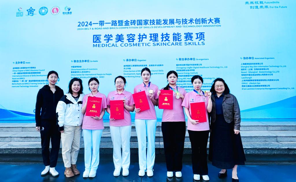 10月27日,2024“一帶一路”暨金磚國(guó)家技能發(fā)展與技術(shù)創(chuàng)新大賽醫(yī)學(xué)美容護(hù)理技能賽項(xiàng)決賽在陜西西安落下帷幕,來(lái)自全國(guó)24所高職高專院校醫(yī)學(xué)美容技術(shù)相關(guān)專業(yè)在校學(xué)生共200余人參加比賽,經(jīng)過(guò)線上選拔賽的篩選,共60名選手進(jìn)入決賽。我校醫(yī)學(xué)美容技術(shù)專業(yè)的5名同學(xué)憑借扎實(shí)的專業(yè)知識(shí)與精湛的實(shí)操技能榮獲一等獎(jiǎng)1項(xiàng)、二等獎(jiǎng)1項(xiàng)、三等獎(jiǎng)1項(xiàng)、優(yōu)秀獎(jiǎng)2項(xiàng),我校榮獲“最佳組織獎(jiǎng)”。