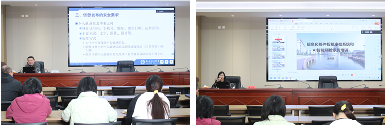 隨后,現(xiàn)代教育技術(shù)中心對新修訂的《網(wǎng)絡安全管理辦法》《信息化項目建設管理辦法》進行解讀,宣傳部對信息化稿件投稿審校系統(tǒng)、AI智能預檢兩個系統(tǒng)進行培訓。通過培訓,全體參會人員進一步提升網(wǎng)絡安全意識,有效防范化解網(wǎng)絡意識形態(tài)潛在風險。