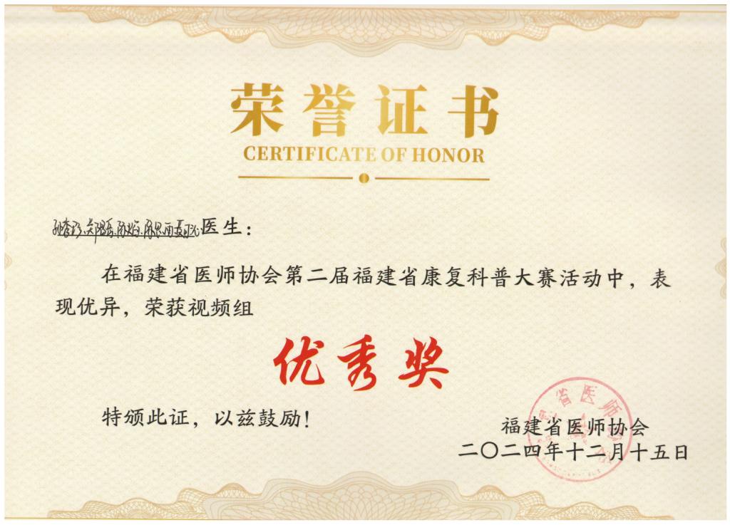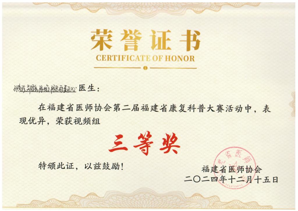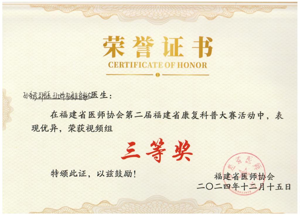 近日,福建省醫(yī)師協(xié)會第二屆康復(fù)科普大賽在福州舉行,我校康復(fù)治療技術(shù)專業(yè)學(xué)生在福建省機關(guān)醫(yī)院帶教老師指導(dǎo)下積極參與本次比賽。經(jīng)過激烈的較量,我校學(xué)生以扎實的專業(yè)技能、獨到的拍攝創(chuàng)意、出色的團隊凝聚力贏得評委和觀眾的認(rèn)可,斬獲視頻組三等獎2項、優(yōu)秀獎1項。