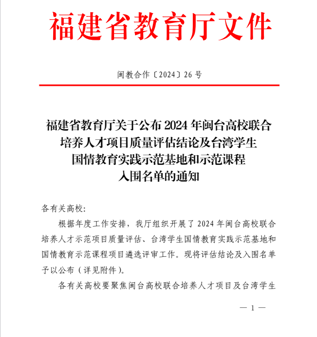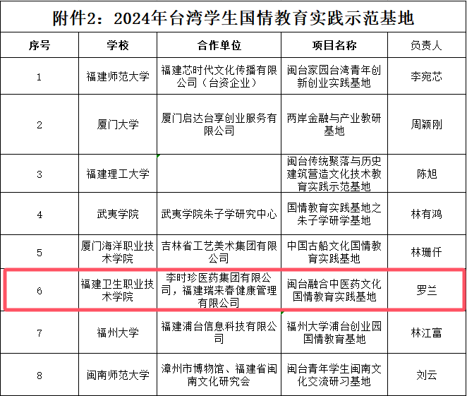 近日,福建省教育廳公布2024年臺灣學(xué)生國情教育實(shí)踐示范基地入圍名單,全省共有8個示范基地入選。我校申報的閩臺融合中醫(yī)藥文化國情教育實(shí)踐基地獲批臺灣學(xué)生國情教育實(shí)踐示范基地項(xiàng)目。