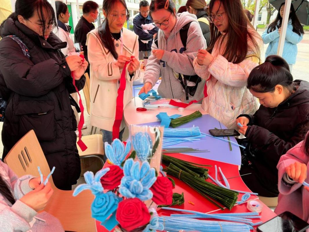 同學(xué)們將各色的扭扭棒和海綿條彎折、纏繞,變成一朵朵栩栩如生的花朵。在制作過(guò)程中,同學(xué)們借手工盡情釋放創(chuàng)意,在專注中慢慢放松身心。