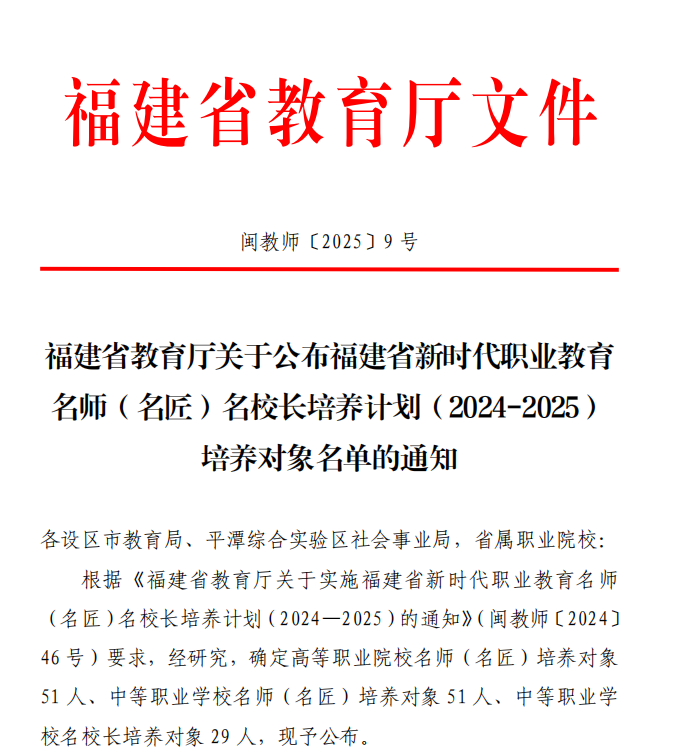 近日,福建省教育廳公布《新時代職業(yè)教育名師(名匠)名校長培養(yǎng)計劃(2024-2025)培養(yǎng)對象名單》,我校龔海蓉、李泳寧兩位教師成功入選福建省新時代職業(yè)教育高職名師培養(yǎng)對象。