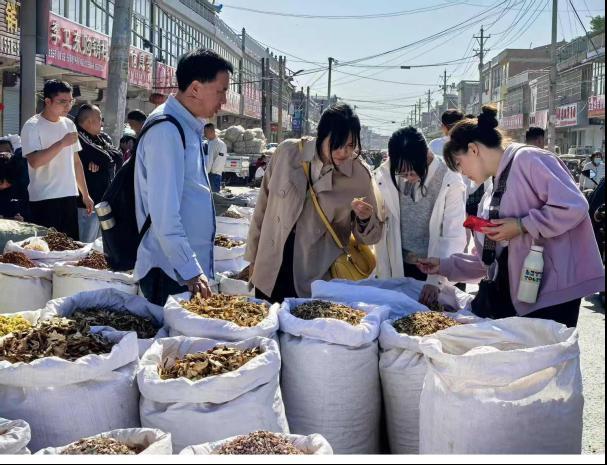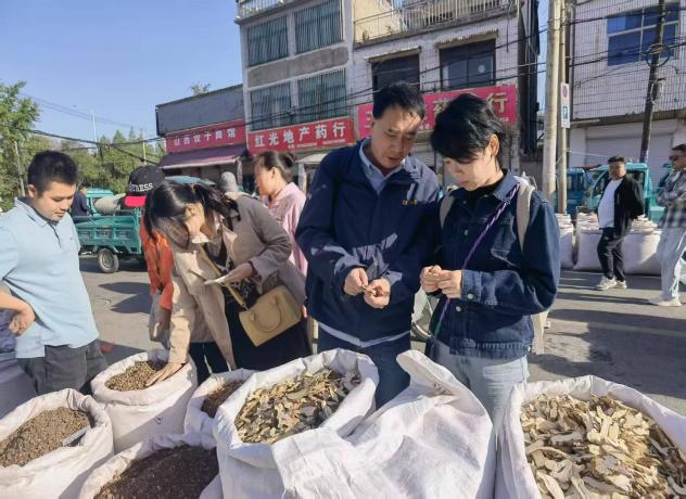 同時,團隊前往全國最大的中藥材飲片交易市場。教師們仔細觀察不同藥材的形態(tài)、質(zhì)地,詢問商家關(guān)于藥材產(chǎn)地、功效及市場行情,了解中藥材流通過程及市場需求動態(tài)。為更全面了解市場,團隊在企業(yè)帶領(lǐng)下奔赴十八里藥材早市,為教學與實踐相結(jié)合積累了鮮活素材。