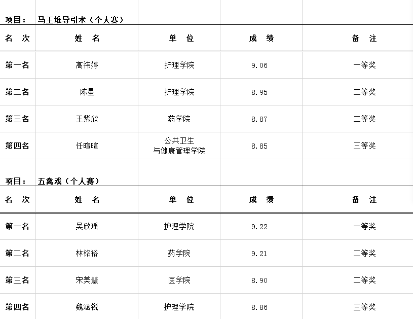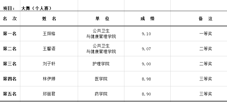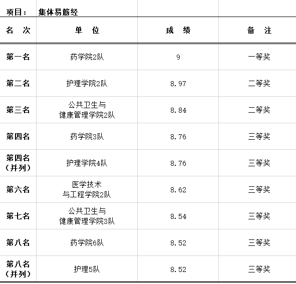 經(jīng)過激烈的角逐,護(hù)理學(xué)院榮獲團(tuán)體總分一等獎,公共衛(wèi)生與健康管理學(xué)院、藥學(xué)院獲團(tuán)體總分二等獎,醫(yī)學(xué)院、醫(yī)學(xué)技術(shù)與工程學(xué)院獲團(tuán)體總分三等獎。