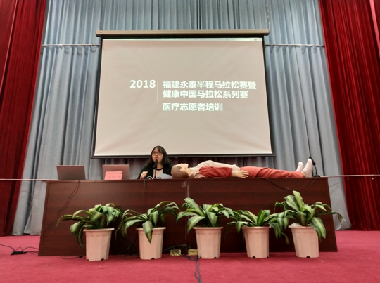 3月11日下午,2018福建永泰半程馬拉松賽暨健康中國馬拉松系列賽醫(yī)療志愿者培訓(xùn)大會在福建衛(wèi)生職業(yè)技術(shù)學(xué)院學(xué)術(shù)廳舉行,由學(xué)院團(tuán)委組織招募的255名志愿者參加,他們分別來自學(xué)生紅十字會、護(hù)理系和臨床醫(yī)學(xué)系。組委會黃宗毅老師和省紅十字急救培訓(xùn)中心鄭明華老師為志愿者進(jìn)行了強(qiáng)化培訓(xùn)。志愿者們將在沿途賽道及主會場,發(fā)揮自己專業(yè)所長協(xié)助組委會和醫(yī)護(hù)人員為參賽者提供醫(yī)療救助服務(wù)。