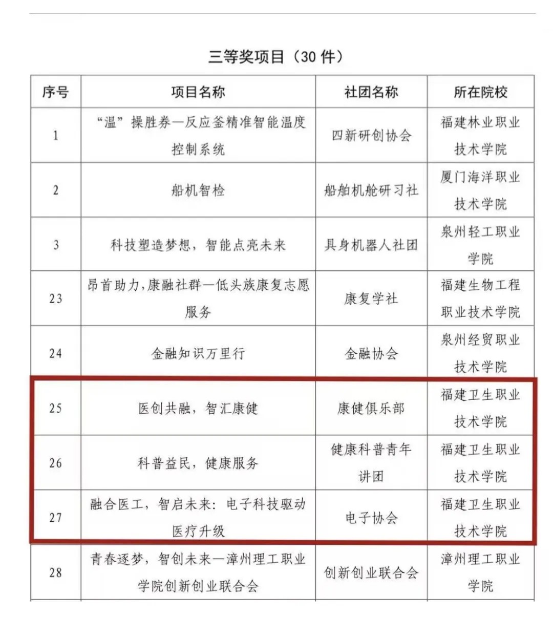 近日,由福建團(tuán)省委主辦,福州大學(xué)承辦的第十七屆“挑戰(zhàn)杯”福建省大學(xué)生課外學(xué)術(shù)科技作品競(jìng)賽配套專項(xiàng)活動(dòng)——2025年福建省高?!翱苿?chuàng)類”社團(tuán)精品項(xiàng)目評(píng)選活動(dòng)圓滿落幕。經(jīng)激烈的現(xiàn)場(chǎng)角逐與專業(yè)評(píng)審團(tuán)的嚴(yán)格評(píng)審,我校康健俱樂(lè)部《醫(yī)創(chuàng)共融,智匯康健》、健康科普青年講團(tuán)《科普益民,健康服務(wù)》、電子協(xié)會(huì)《融合醫(yī)工,智啟未來(lái):電子科技驅(qū)動(dòng)醫(yī)療升級(jí)》三個(gè)項(xiàng)目在職業(yè)院校組中表現(xiàn)優(yōu)異,均榮獲省級(jí)三等獎(jiǎng)。