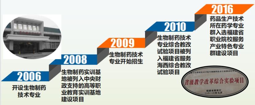 隨著《國務(wù)院關(guān)于支持福建省加快建設(shè)海峽西岸經(jīng)濟(jì)區(qū)的若干意見》和《促進(jìn)生物產(chǎn)業(yè)加快發(fā)展若干政策》等文件的頒布以及福建省出臺(tái)的《生物與新醫(yī)藥產(chǎn)業(yè)振興實(shí)施方案》,學(xué)校加大對(duì)藥品生產(chǎn)技術(shù)專業(yè)建設(shè)的投入和扶持,藥品生產(chǎn)技術(shù)專業(yè)快速發(fā)展。2008年生物制藥實(shí)訓(xùn)基地被列入中央財(cái)政支持的高等職業(yè)教育實(shí)訓(xùn)基地建設(shè)項(xiàng)目,2010年生物制藥技術(shù)專業(yè)綜合教改試驗(yàn)項(xiàng)目被列入福建省服務(wù)海西綜合教改試驗(yàn)項(xiàng)目;2011年參與了教育部高職高專生物制藥技術(shù)專業(yè)教學(xué)資源庫建設(shè);2013年入選福建省高等職業(yè)教育生產(chǎn)性實(shí)訓(xùn)基地;2016年藥學(xué)專業(yè)群(含藥品生產(chǎn)技術(shù)專業(yè))入選福建省職業(yè)院校服務(wù)產(chǎn)業(yè)特色專業(yè)群建設(shè)項(xiàng)目,2017年藥學(xué)專業(yè)群實(shí)訓(xùn)基地(含藥品生產(chǎn)技術(shù)專業(yè))入選福建省職業(yè)院校專業(yè)群實(shí)訓(xùn)基地培育項(xiàng)目。2021年,藥學(xué)專業(yè)群(含藥品生產(chǎn)技術(shù)專業(yè))入選福建省職業(yè)院校高水平專業(yè)群。