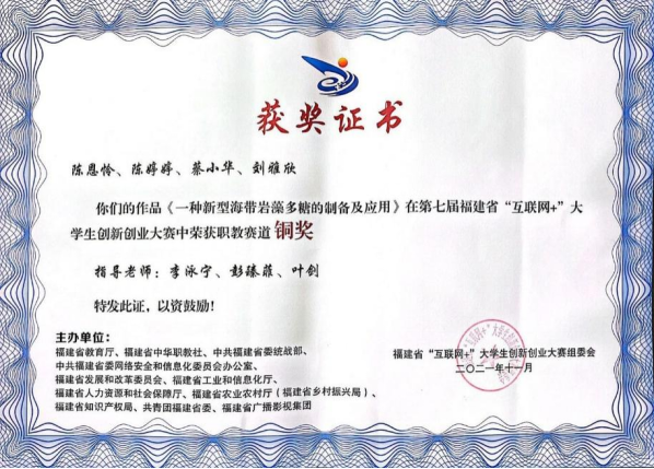 第七屆福建省“互聯(lián)網(wǎng)+”創(chuàng)新創(chuàng)業(yè)大賽職教賽道銅獎(jiǎng)證書