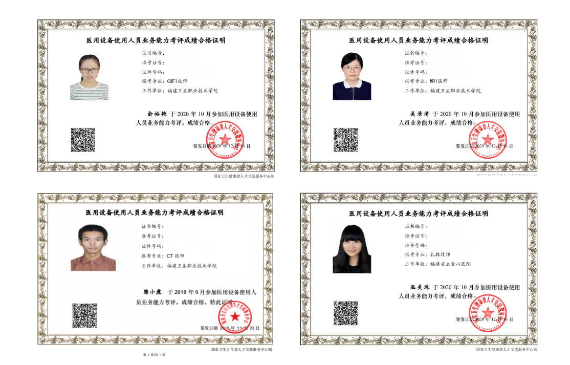 學(xué)生畢業(yè)頒發(fā)福建省教育廳統(tǒng)一印制、國(guó)家教育部電子注冊(cè)的專科畢業(yè)證書,可考取放射人員工作證、CT技師、MRI技師、CDFI技師等證書;“放療班”可另獲取放射治療技術(shù)方向證書。