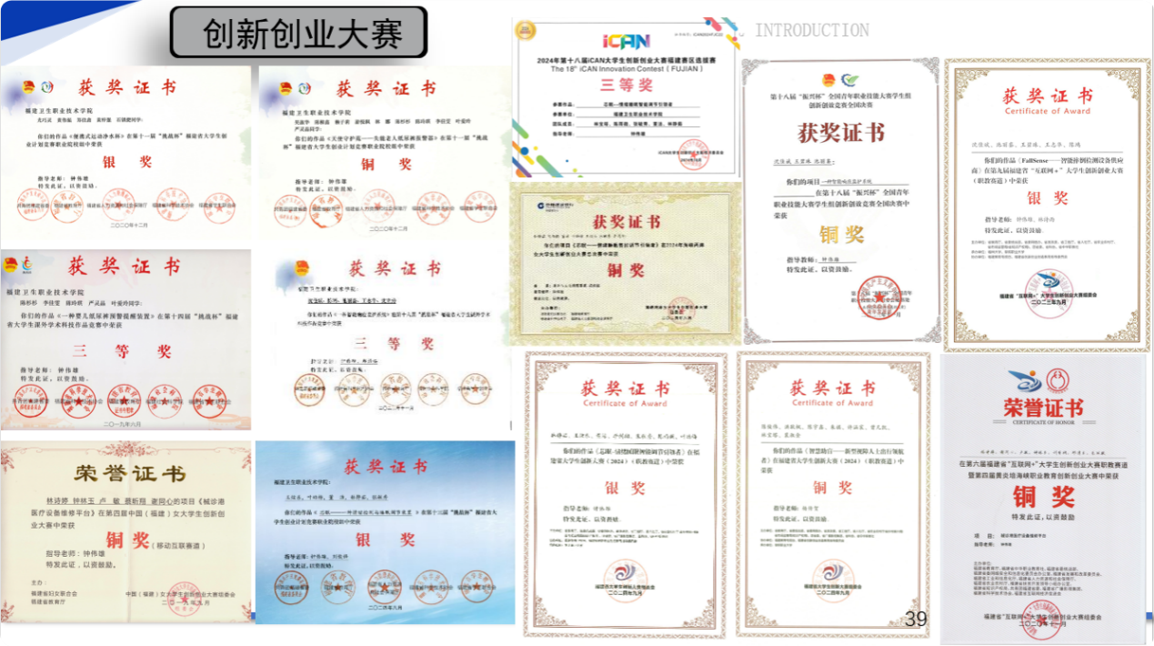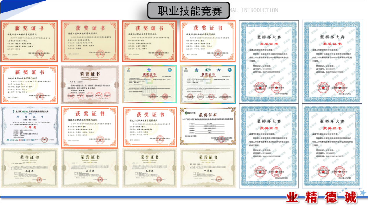學(xué)生獲得全國(guó)醫(yī)用電子儀器技術(shù)職業(yè)技能大賽個(gè)人二等獎(jiǎng)1項(xiàng)、個(gè)人三等獎(jiǎng)1項(xiàng)、團(tuán)體三等獎(jiǎng)2項(xiàng),2022-2023“一帶一路”暨金磚國(guó)家技能發(fā)展與技術(shù)創(chuàng)新大賽一等獎(jiǎng)和最佳組織獎(jiǎng)1項(xiàng),第十八屆“振興杯”全國(guó)青年職業(yè)技能大賽學(xué)生組創(chuàng)新創(chuàng)效競(jìng)賽全國(guó)決賽銅獎(jiǎng)1項(xiàng),福建省職業(yè)院校技能大賽集成電路開(kāi)發(fā)及應(yīng)用賽項(xiàng)二等獎(jiǎng)3項(xiàng)、三等獎(jiǎng)1項(xiàng),福建省職業(yè)院校技能大賽物聯(lián)網(wǎng)技術(shù)應(yīng)用賽項(xiàng)三等獎(jiǎng)2項(xiàng)、福建省職業(yè)院校技能大賽智能電子產(chǎn)品設(shè)計(jì)與開(kāi)發(fā)賽項(xiàng)二等獎(jiǎng)1項(xiàng)、福建省第二屆國(guó)銳杯增材制造技術(shù)綜合應(yīng)用技能大賽三等獎(jiǎng)1項(xiàng),“挑戰(zhàn)杯”福建省大學(xué)生課外學(xué)術(shù)作品競(jìng)賽三等獎(jiǎng)2項(xiàng),“挑戰(zhàn)杯”福建省大學(xué)生創(chuàng)業(yè)計(jì)劃競(jìng)賽銀獎(jiǎng)2項(xiàng)、銅獎(jiǎng)1項(xiàng),福建省“互聯(lián)網(wǎng)+”大學(xué)生創(chuàng)新創(chuàng)業(yè)大賽銀獎(jiǎng)1項(xiàng)、銅獎(jiǎng)1項(xiàng),中國(guó)(福建)女大學(xué)生創(chuàng)新創(chuàng)業(yè)大賽銅獎(jiǎng)1項(xiàng)、福建省大學(xué)城創(chuàng)新大賽(2024)銀獎(jiǎng)1項(xiàng)、銅獎(jiǎng)1項(xiàng),2022一帶一路暨金磚國(guó)家技能發(fā)展與技術(shù)創(chuàng)新大賽浙區(qū)域賽二等獎(jiǎng)、海峽兩岸大學(xué)生職業(yè)技能大賽物聯(lián)網(wǎng)技術(shù)應(yīng)用賽項(xiàng)三等獎(jiǎng)2項(xiàng)、智能硬件開(kāi)發(fā)與應(yīng)用一等獎(jiǎng)1項(xiàng)、二等獎(jiǎng)1項(xiàng)。碼蹄杯全國(guó)大學(xué)生程序設(shè)計(jì)大賽職業(yè)院校賽道省賽金獎(jiǎng)1項(xiàng)、銅獎(jiǎng)4項(xiàng)、第十五屆藍(lán)橋杯全國(guó)軟件和信息技術(shù)專(zhuān)業(yè)人才大賽福建賽區(qū)Python程序設(shè)計(jì)三等獎(jiǎng)2項(xiàng)、物聯(lián)網(wǎng)設(shè)計(jì)與開(kāi)發(fā)大學(xué)組三等獎(jiǎng)1項(xiàng)、單片機(jī)設(shè)計(jì)與開(kāi)發(fā)職業(yè)院校組三等獎(jiǎng)1項(xiàng)。學(xué)生參與教師科研,獲國(guó)家專(zhuān)利2項(xiàng),國(guó)家計(jì)算機(jī)軟件著作權(quán)證書(shū)4項(xiàng)。