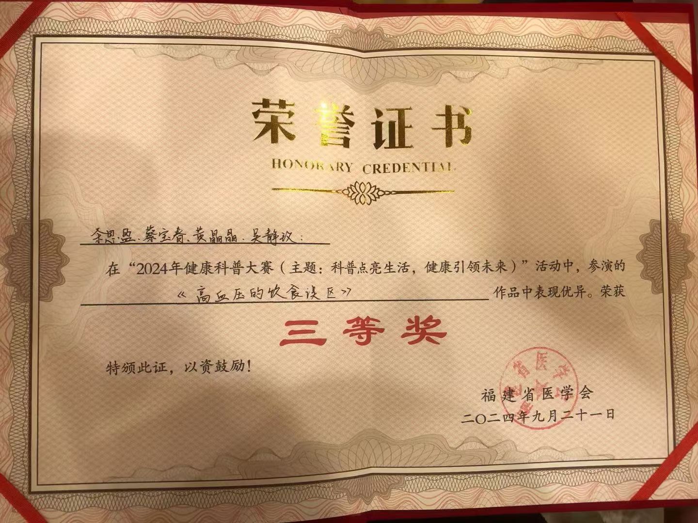獲福建省第六屆“全民營養(yǎng)周”系列活動(dòng)之線上科普作品大賽,特等獎(jiǎng)、一等獎(jiǎng)、二等獎(jiǎng)各1項(xiàng) |