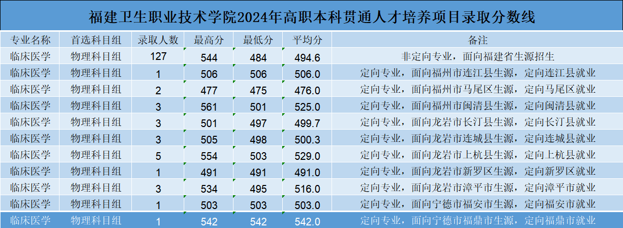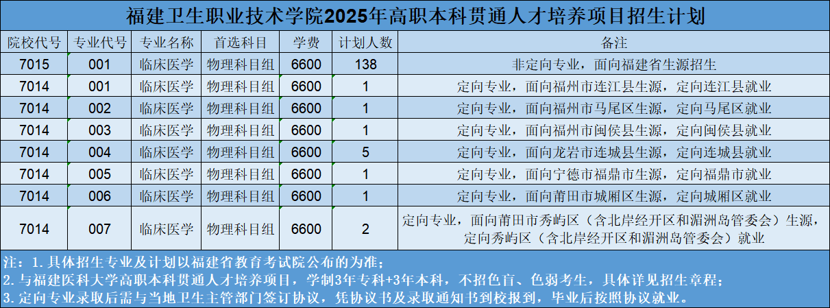 臨床醫(yī)學專業(yè)“3+3”高職本科貫通人才培養(yǎng)項目由福建衛(wèi)生職業(yè)技術學院與福建醫(yī)科大學聯(lián)辦,培養(yǎng)臨床醫(yī)學應用型本科人才。我校自2021年在福建省內首創(chuàng)該項目,至今已連續(xù)招生4屆。項目充分融合兩校的醫(yī)學人才培養(yǎng)理念、師資隊伍、實訓實習資源等辦學優(yōu)勢,采取高職-本科貫通的人才培養(yǎng)模式,聯(lián)合培養(yǎng)臨床全科醫(yī)學專業(yè)人才,學制為“3+3”年(高職階段3年+本科階段3年)。2025年面向福建省招生計劃數(shù)為150人(包括定向生12人,非定向生138人)。定向生轉段成功進入本科階段學習,順利畢業(yè)后還能夠入編入崗包就業(yè),在校期間還有學費補助等。本項目在福建省高職(專科)批次錄取,常規(guī)志愿和征求志愿均實行專業(yè)平行志愿投檔的錄取模式。