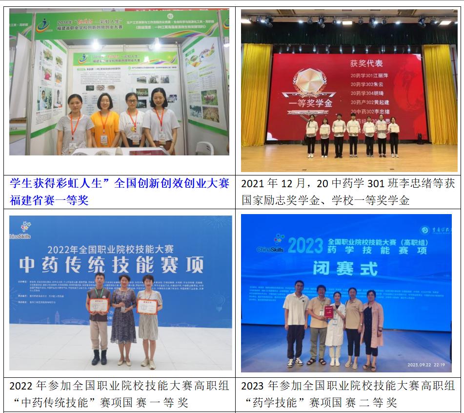 藥學(xué)院高度重視學(xué)生綜合素質(zhì)、應(yīng)用創(chuàng)新能力的培養(yǎng),設(shè)立“本草社”“膳飲工坊”“植物醫(yī)館”等學(xué)生專業(yè)社團(tuán),近5年學(xué)生共獲得全國(guó)及福建省高等職業(yè)院校技能大賽獎(jiǎng)項(xiàng)55項(xiàng),其中國(guó)家級(jí)6項(xiàng),省賽一等獎(jiǎng)10項(xiàng)。參加全國(guó)及福建省創(chuàng)新創(chuàng)業(yè)大賽獲得獎(jiǎng)項(xiàng)10項(xiàng),其中獲得國(guó)家級(jí)創(chuàng)新創(chuàng)業(yè)大賽二等獎(jiǎng)1項(xiàng),省級(jí)創(chuàng)新創(chuàng)業(yè)大賽一等獎(jiǎng)2項(xiàng)、三等獎(jiǎng)7項(xiàng)。近三屆畢業(yè)生就業(yè)率均在98%以上,專業(yè)對(duì)口率高,就業(yè)質(zhì)量逐年提升。