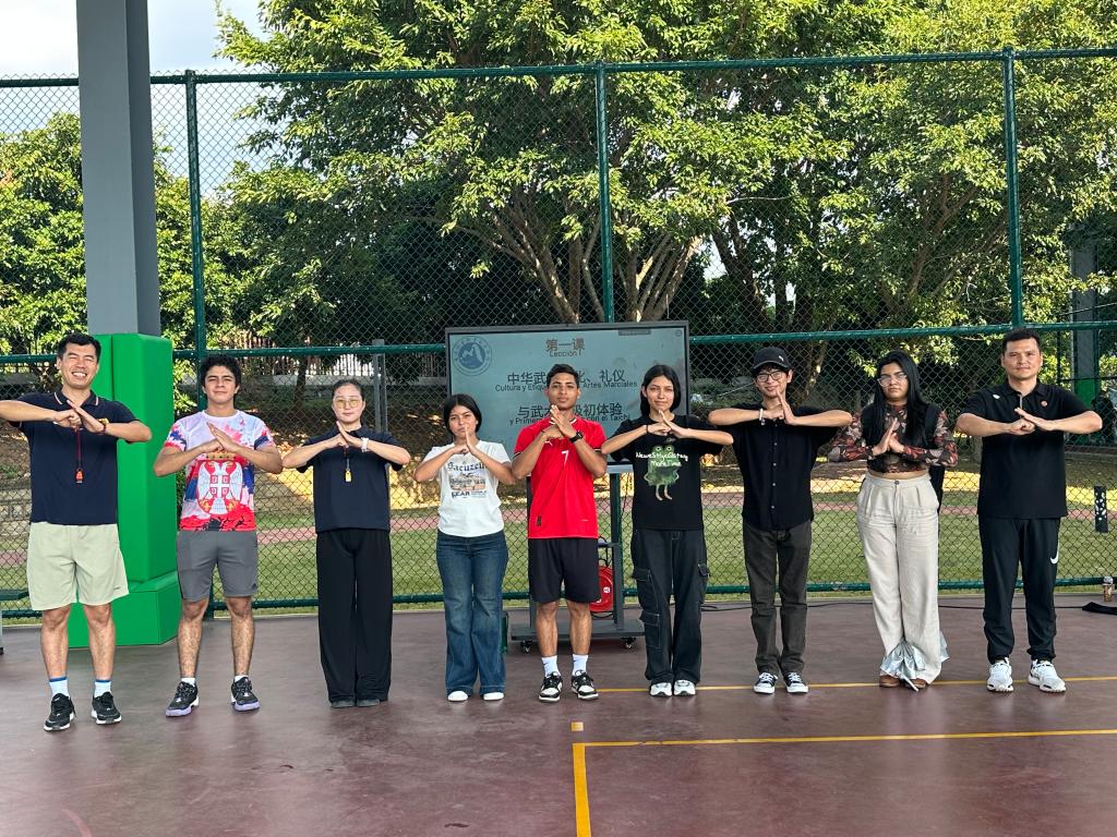 課堂伊始,劉芳芳老師講授了太極拳數(shù)百年的歷史傳承以及文化內(nèi)核,并以抱拳禮動(dòng)作的學(xué)習(xí)為切入點(diǎn),將“以禮始、以禮終”的武德精神與和諧包容的價(jià)值理念灌輸給國(guó)際生,現(xiàn)場(chǎng)學(xué)生表現(xiàn)出極大的學(xué)習(xí)興趣。在隨后的教學(xué)過(guò)程中,劉芳芳老師從太極拳基礎(chǔ)招式開(kāi)始分解教學(xué),并穿梭于學(xué)生之間進(jìn)行一對(duì)一指導(dǎo),留學(xué)生們認(rèn)真揣摩,積極互動(dòng),在汗水中體會(huì)著中國(guó)功夫的獨(dú)特神韻與文化美感。