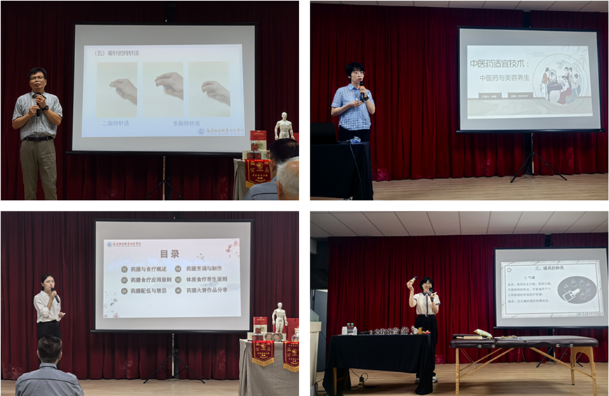 之后,主辦雙方開展七場(chǎng)“中醫(yī)藥適宜技術(shù)系列講座”。我校教師主講了《針灸技術(shù)》《艾灸技術(shù)》《拔罐技術(shù)》《刮痧技術(shù)》《中醫(yī)藥與美容養(yǎng)生》《藥膳與食療》和《膝關(guān)節(jié)康復(fù)功法》等講座,圍繞針灸、艾灸、拔罐、刮痧、中醫(yī)美容養(yǎng)生等傳統(tǒng)技藝,并融入藥膳食療、全身肢體康復(fù)功法等生活化養(yǎng)生內(nèi)容,吸引大批當(dāng)?shù)孛癖娂爸嗅t(yī)從業(yè)者踴躍參與,現(xiàn)場(chǎng)互動(dòng)熱烈,反響積極,充分展現(xiàn)了中醫(yī)藥文化的獨(dú)特魅力與實(shí)用價(jià)值。