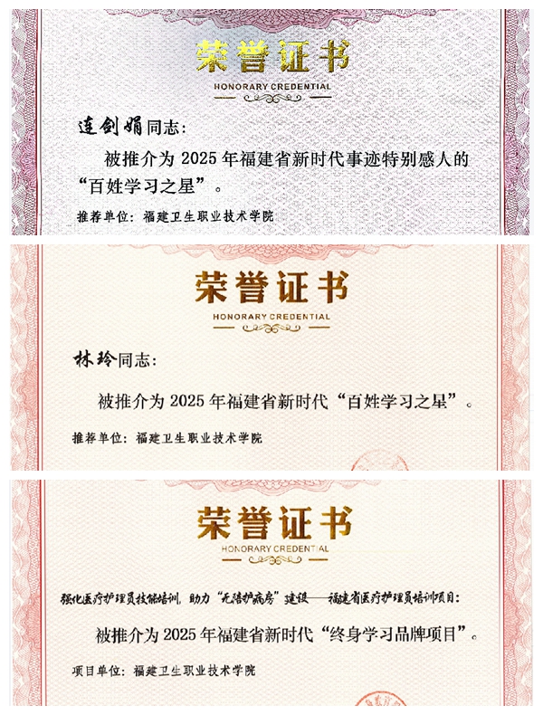開幕式上,福建省教育廳舉行表彰儀式,對(duì)2025年省級(jí)“百姓學(xué)習(xí)之星”與“終身學(xué)習(xí)品牌項(xiàng)目”的入選對(duì)象進(jìn)行表彰。得益于前期在終身教育重點(diǎn)項(xiàng)目上的積極投入與建設(shè),我校在此次表彰中取得了顯著成績(jī):繼續(xù)教育學(xué)院聯(lián)合護(hù)理學(xué)院申報(bào)的“強(qiáng)化醫(yī)療護(hù)理員技能培訓(xùn),助力‘無陪護(hù)病房’建設(shè)——福建省醫(yī)療護(hù)理員培訓(xùn)項(xiàng)目”榮獲2025年福建省新時(shí)代“終身學(xué)習(xí)品牌項(xiàng)目”;護(hù)理學(xué)院連劍娟副教授、藥學(xué)院林玲副教授榮獲2025年福建省新時(shí)代“百姓學(xué)習(xí)之星”。
