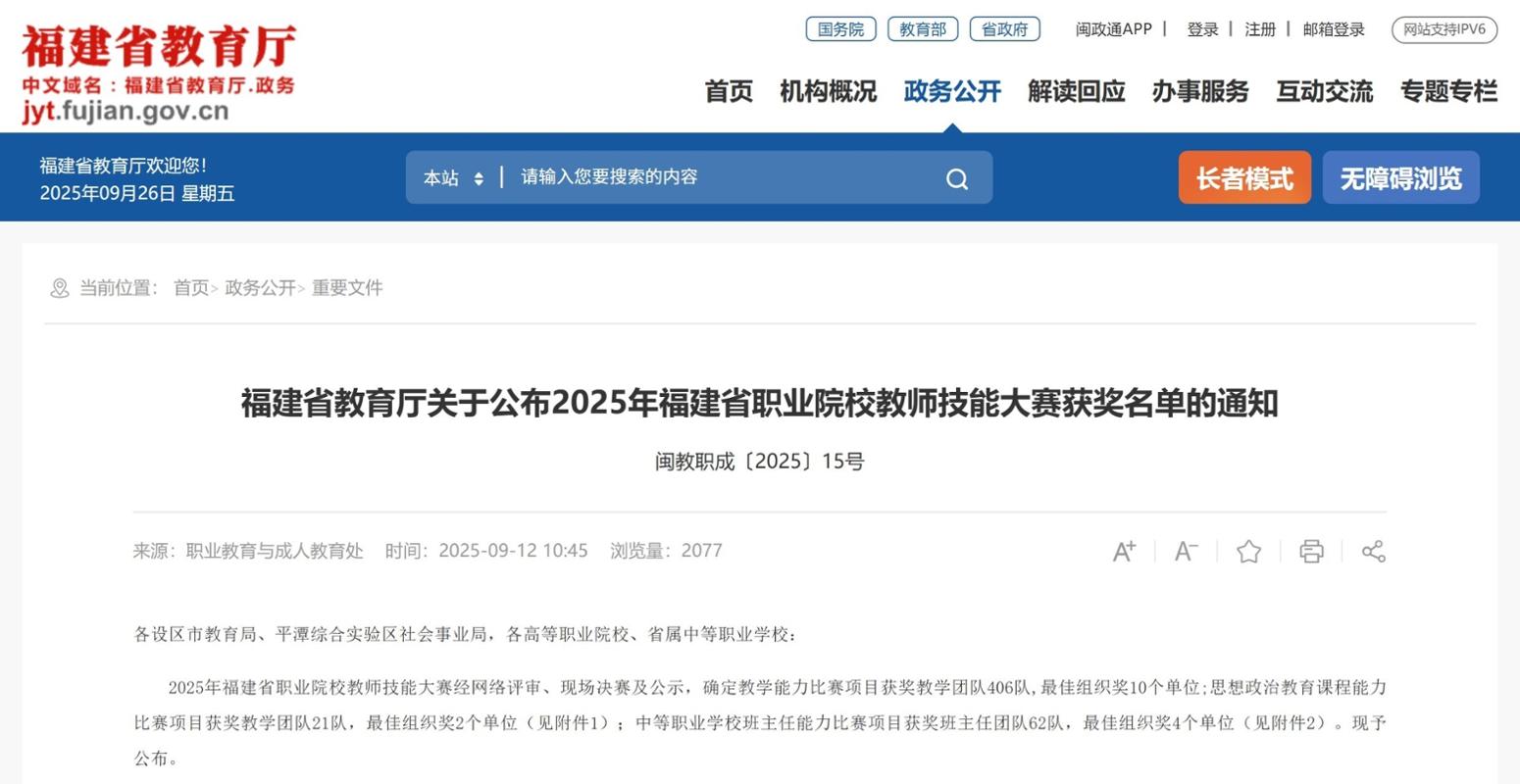 近日,2025年福建省職業(yè)院校技能大賽教學(xué)能力比賽圓滿落幕,我校教師一路披荊斬棘,榮獲一等獎2項、二等獎4項、三等獎6項的優(yōu)異成績,而學(xué)校則憑借卓越的賽事組織效能與優(yōu)異的教學(xué)競技成果,榮獲大賽組委會授予的“最佳組織獎”,實現(xiàn)賽事成績與組織榮譽(yù)的“雙豐收”。