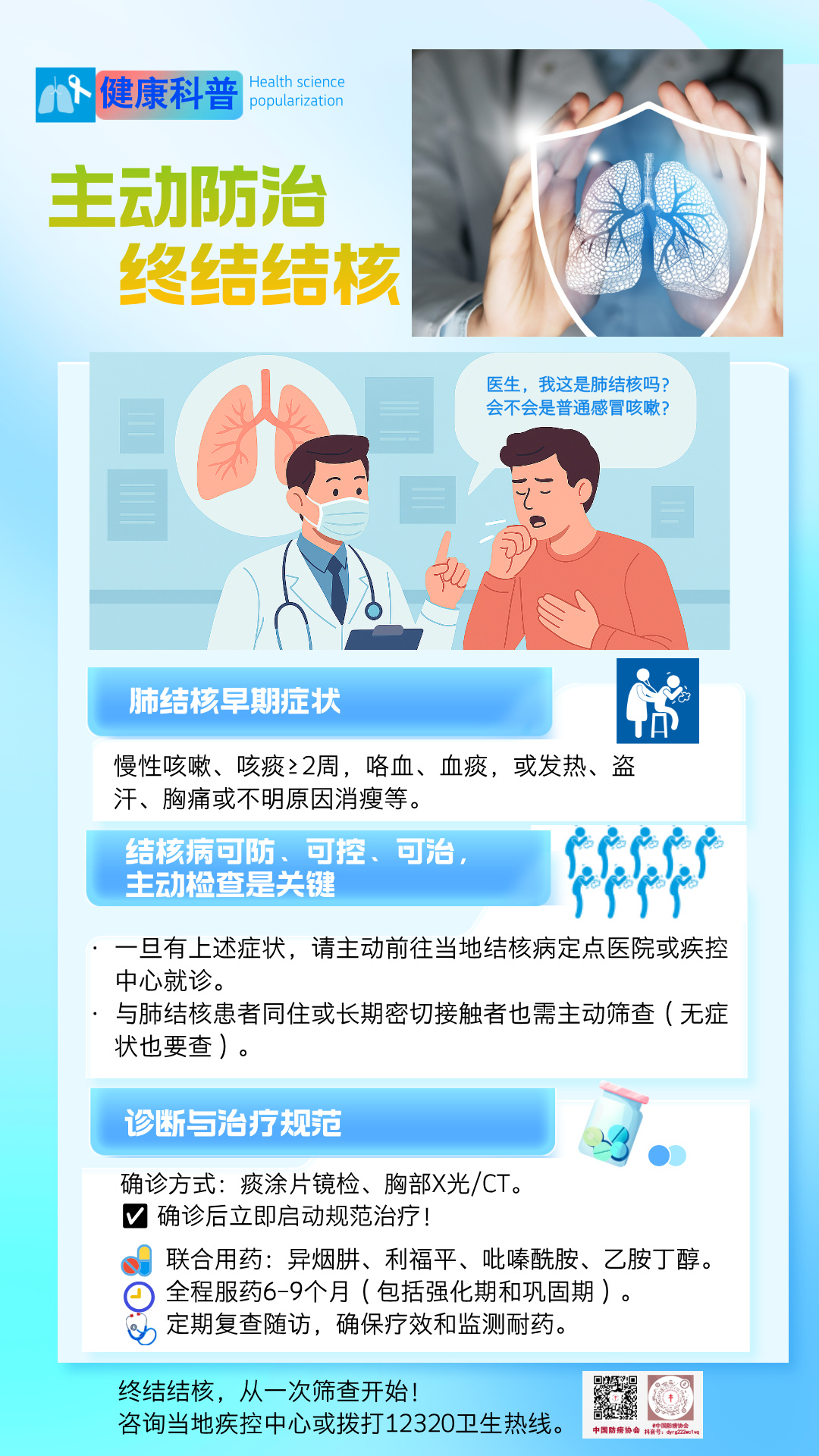 參賽作品《主動防治 終結(jié)結(jié)核》,以“可防、可控、可治”為核心傳播理念,精準(zhǔn)聚焦公眾在結(jié)核病認(rèn)知中的常見困惑與痛點(diǎn)。作品通過生動形象的圖文與醫(yī)患對話場景,將“咳嗽兩周是否需要篩查”“確診后如何規(guī)范治療”等專業(yè)醫(yī)學(xué)知識,轉(zhuǎn)化為通俗易懂的公眾語言。作品強(qiáng)調(diào)了“早診早治”的關(guān)鍵作用,有效指導(dǎo)公眾識別早期癥狀、主動參與篩查,為筑牢結(jié)核病防控的“第一道防線”提供了科學(xué)、實(shí)用的行動指南。