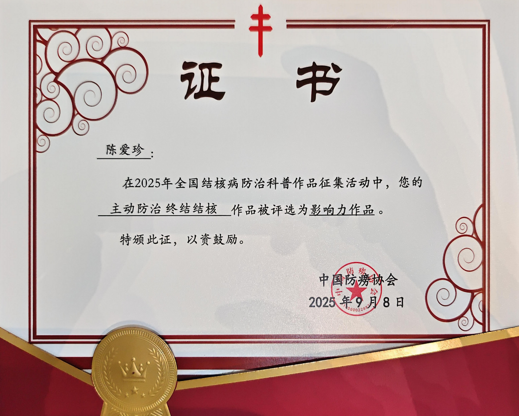 近日,中國防癆協(xié)會公布了《關(guān)于發(fā)布2025年全國結(jié)核病防治科普作品征集活動結(jié)果和宣傳推廣的通報》,公共衛(wèi)生與健康管理學(xué)院陳愛珍老師創(chuàng)作的科普作品《主動防治 終結(jié)結(jié)核》,從全國1931件參賽作品中脫穎而出,榮獲最佳科普作品中的“影響力作品”。