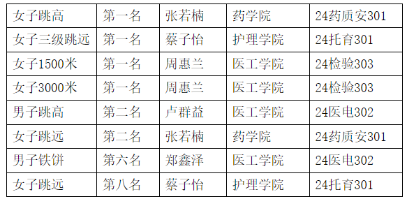 我校田徑隊6名運(yùn)動員在體育部唐圣、崔國正、連期待等老師的悉心指導(dǎo)下認(rèn)真?zhèn)鋺?zhàn)、刻苦訓(xùn)練,賽場上不畏強(qiáng)手、勇于拼搏,經(jīng)過3天的激烈角逐,獲得4金2銀的佳績,并打破1項校田徑最高紀(jì)錄。