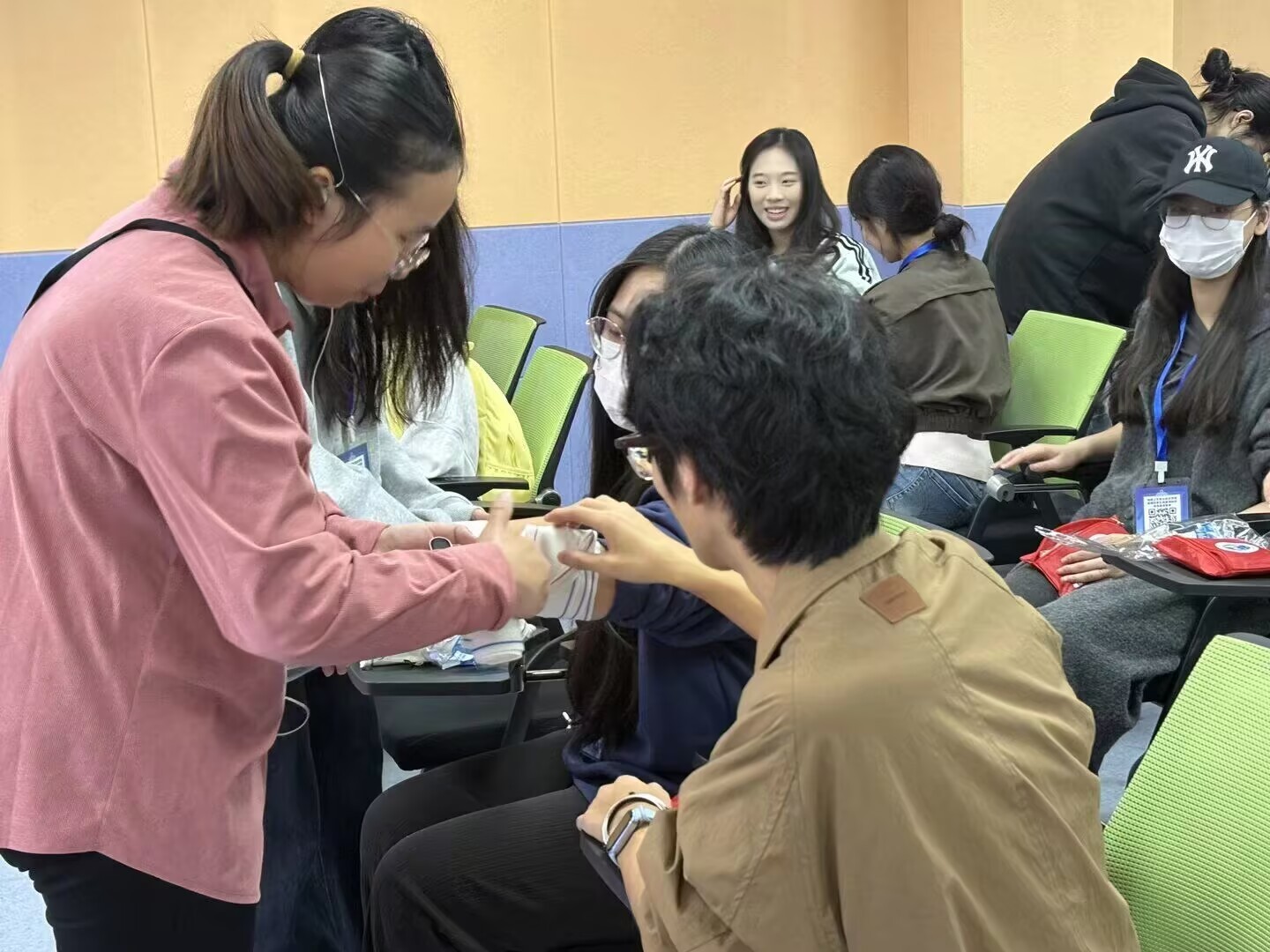 在紅十字生命教育體驗(yàn)學(xué)堂的急救實(shí)訓(xùn)環(huán)節(jié),重點(diǎn)聚焦繃帶與三角巾包扎技能培訓(xùn)。專業(yè)指導(dǎo)教師立足醫(yī)學(xué)原理,系統(tǒng)講解包扎的生物力學(xué)依據(jù)與臨床操作規(guī)范,細(xì)致拆解角度校準(zhǔn)、松緊調(diào)節(jié)、特殊部位處理等標(biāo)準(zhǔn)化流程。師生圍繞模擬擦傷、扭傷場(chǎng)景分組實(shí)操,針對(duì)性開(kāi)展頭、臂、腿等關(guān)鍵部位的包扎訓(xùn)練,在反復(fù)調(diào)整與實(shí)時(shí)糾錯(cuò)中熟練掌握急救要領(lǐng)。這一過(guò)程不僅夯實(shí)了大家的應(yīng)急救護(hù)實(shí)操能力,更讓“科學(xué)急救是生命防護(hù)第一道防線”的理念深入人心,為日常健康安全筑牢堅(jiān)實(shí)保障。