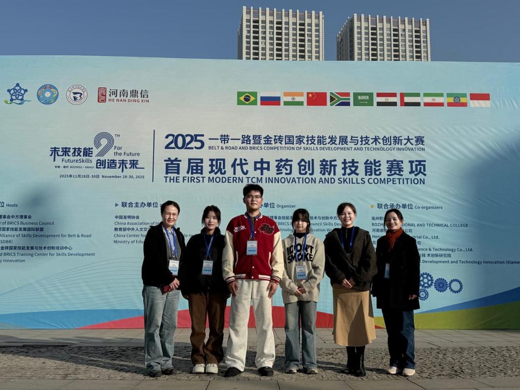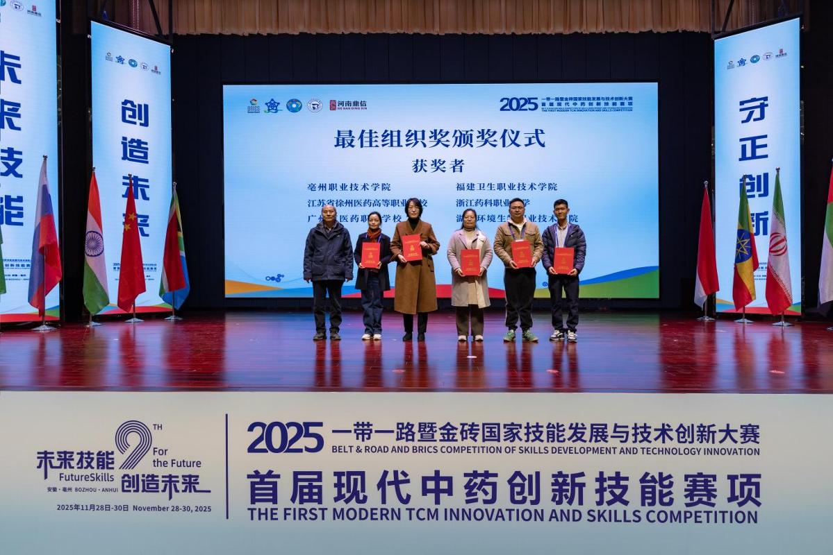 11月27日至30日,2025“一帶一路”暨金磚國家技能發(fā)展與技術(shù)創(chuàng)新大賽首屆現(xiàn)代中藥創(chuàng)新技能賽項(xiàng)在安徽亳州職業(yè)技術(shù)學(xué)院圓滿落幕。大賽聚焦中藥學(xué)傳統(tǒng)經(jīng)驗(yàn)與現(xiàn)代科技的深度融合,旨在解決中藥材質(zhì)量控制、生產(chǎn)規(guī)范及臨床合理用藥等核心問題,包括理論考核模塊、AI審方技能、中藥炮制虛擬仿真操作、技能操作競(jìng)賽(中藥性狀鑒別模塊、中藥顯微鑒別模塊、中藥炮制模塊)和現(xiàn)代中藥創(chuàng)新設(shè)計(jì)模塊四部分。經(jīng)過初賽選拔,決賽匯聚全國60所院校的優(yōu)秀師生團(tuán)隊(duì),搭建起現(xiàn)代中藥行業(yè)人才培養(yǎng)與技術(shù)交流的高水平平臺(tái)。