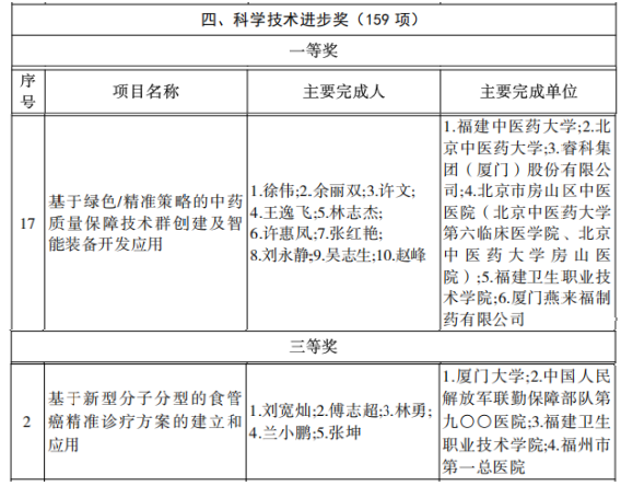 近日,福建省人民政府印發(fā)《關(guān)于2024年度省科學(xué)技術(shù)獎(jiǎng)勵(lì)的決定》,由我校與福建中醫(yī)藥大學(xué)、??萍瘓F(tuán)(廈門)股份有限公司等單位聯(lián)合完成的《基于綠色/精準(zhǔn)策略的中藥質(zhì)量保障技術(shù)群創(chuàng)建及智能裝備開發(fā)應(yīng)用》項(xiàng)目,榮獲福建省科學(xué)技術(shù)進(jìn)步獎(jiǎng)一等獎(jiǎng);與廈門大學(xué)、中國(guó)人民解放軍聯(lián)勤保障部隊(duì)第九〇〇醫(yī)院等單位聯(lián)合完成的《基于新型分子分型的食管癌精準(zhǔn)診療方案的建立和應(yīng)用》項(xiàng)目,榮獲福建省科學(xué)技術(shù)進(jìn)步獎(jiǎng)三等獎(jiǎng)。據(jù)悉,本年度福建省僅兩所高職院校獲獎(jiǎng)。