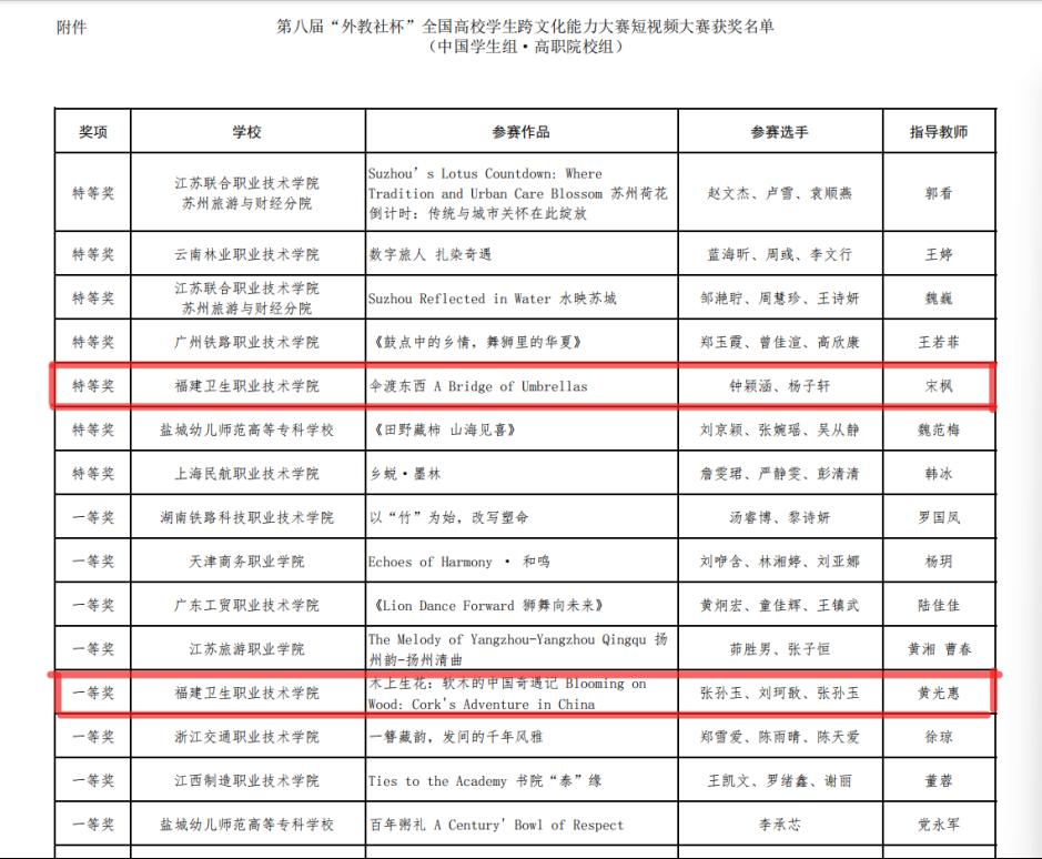 近日,以“講述中國(guó),傳播中國(guó)”為主題的第八屆“外教社杯”全國(guó)高校學(xué)生跨文化能力大賽全國(guó)總決賽在上海圓滿(mǎn)落幕。本屆大賽競(jìng)爭(zhēng)激烈,吸引了全國(guó)高校2500余支隊(duì)伍參賽。經(jīng)過(guò)各省賽區(qū)嚴(yán)格選拔,僅有392份優(yōu)秀作品晉級(jí)全國(guó)賽。我校學(xué)子憑借出色的創(chuàng)意、扎實(shí)的英語(yǔ)功底與卓越的跨文化表達(dá)能力,在短視頻賽項(xiàng)中表現(xiàn)優(yōu)異,最終斬獲中國(guó)學(xué)生高職院校組特等獎(jiǎng)和一等獎(jiǎng)各一項(xiàng),充分展現(xiàn)了我校學(xué)生的綜合素質(zhì)與團(tuán)隊(duì)風(fēng)采。同時(shí),我校也憑借出色的組織工作榮獲大賽“優(yōu)秀組織獎(jiǎng)”。
