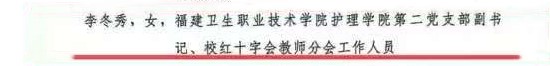 李冬秀,中共黨員,福建衛(wèi)生職業(yè)技術(shù)學(xué)院護(hù)理學(xué)院第二黨支部副書記、教師,紅十字會會員。