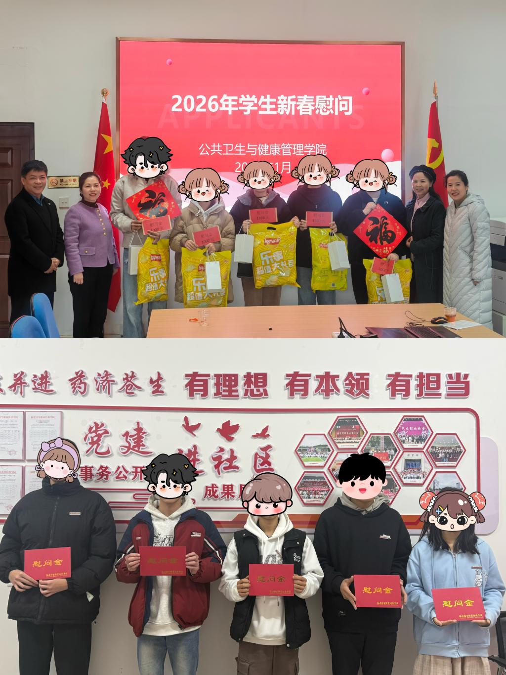 藥學(xué)院、公共衛(wèi)生與健康管理學(xué)院分別開(kāi)展2026年新春座談會(huì)。學(xué)院領(lǐng)導(dǎo)、輔導(dǎo)員與學(xué)生代表親切交流,細(xì)致詢(xún)問(wèn)同學(xué)們?cè)谛W(xué)習(xí)生活情況,認(rèn)真傾聽(tīng)大家的實(shí)際需求與意見(jiàn)建議。與會(huì)家庭經(jīng)濟(jì)困難學(xué)生代表匯報(bào)了他們的學(xué)習(xí)生活和獲獎(jiǎng)資助情況,表達(dá)了對(duì)黨和國(guó)家資助政策的感恩,對(duì)學(xué)校關(guān)心、關(guān)愛(ài)與關(guān)懷的感謝。學(xué)院向困難學(xué)生發(fā)放暖心物資,并送上新春祝福。
