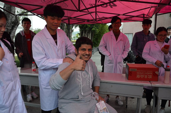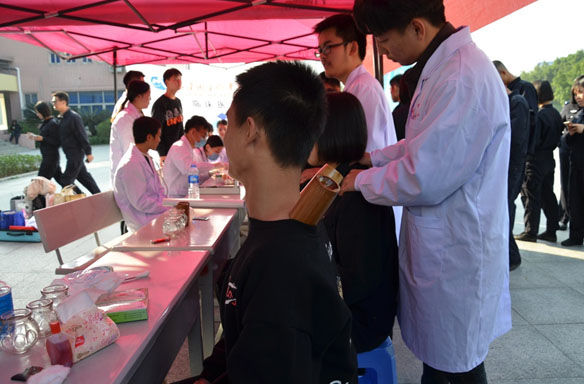 福建警察學(xué)院法律系的王琦老師帶領(lǐng)同學(xué)們領(lǐng)略了警院的風(fēng)光,隨后同學(xué)們來到了模擬法庭,通過最真實的模擬庭審讓同學(xué)們身臨其境地了解到有關(guān)法律法規(guī),具有較強(qiáng)的普法意義。與此同時,職教宣傳的活動正如火如荼地進(jìn)行,我院康健俱樂部、專業(yè)應(yīng)用與實踐協(xié)會、團(tuán)員先鋒隊為警院的同學(xué)們帶去了保健按摩、拔罐、血型檢驗、血壓測量等義診項目,徐麗鶯老師與王欽敏老師通過現(xiàn)場示教的方式,讓警院的師生們感受到耳穴療法的魅力,活動現(xiàn)場十分火爆,吸引了警院沙特班同學(xué)的圍觀。宣講活動后,我院臨床系代表隊與警察學(xué)院法律二隊進(jìn)行了籃球友誼賽,球員們在賽場上努力拼搏,通過籃球賽拉近了距離,增進(jìn)了友誼。