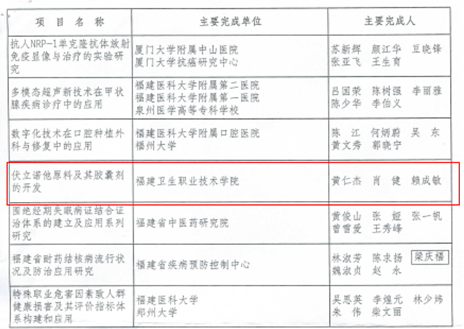 根據(jù)《福建省醫(yī)學(xué)會(huì)關(guān)于表彰福建醫(yī)學(xué)科技獎(jiǎng)獲獎(jiǎng)項(xiàng)目的決定》(閩醫(yī)會(huì)〔2017〕112號(hào))文件通知,我院黃仁杰、肖健等老師為主要完成人的“伏立諾他原料及其膠囊劑的開發(fā)”項(xiàng)目喜獲2017年福建省醫(yī)學(xué)科技獎(jiǎng)三等獎(jiǎng)。