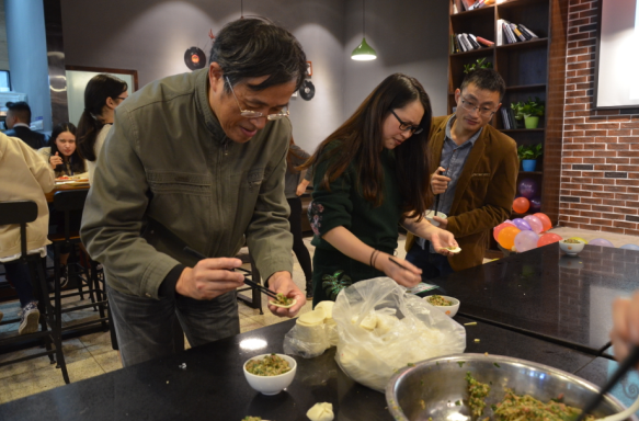 首先,林建團副書記上臺對各位少數(shù)民族同學的到來表示熱烈歡迎,并希望通過此次活動促進不同民族之間的文化交流。各職能部門領導針對11月2日臨床醫(yī)學系少數(shù)民族學生座談會上同學們的建議給予一一答復。接下來,畬族的同學們?yōu)榇蠹規(guī)砹司实闹窀臀?,少?shù)民族特色的知識競答環(huán)節(jié)將活動氣氛推向高潮。在美妙的歌聲中,同學們品嘗著民族特色美食:羊肉串、肉夾饃、草袋飯等。最后,領導老師們和同學們一起切土豆、包水餃,共同烹制美食。