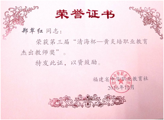 近日,福建省中華職業(yè)教育社公布了《關于表彰第三屆“清海杯—黃炎培職業(yè)教育獎”獲獎單位和個人的決定》(閩職社〔2016〕55號),我院護理系鄭翠紅教授榮獲第三屆“清海杯-黃炎培職業(yè)教育獎”杰出教師獎。
