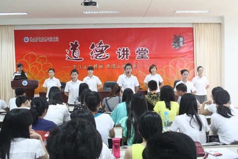 為了貫徹落實黨的十八大精神,加強社會主義核心價值體系建設,提升師生的道德素質(zhì),促進精神文明建設,共建和諧校園,實現(xiàn)學生全面發(fā)展。公共基礎部于6月17日上午在行政樓六樓舉辦了以“引領(lǐng)道德新風尚,傳遞青春正能量”主題的道德講堂活動。學院黨委書記林春明、黨委工作部董榕部長、系部熊美蘭主任、洪聿榮書記、部分教師以及全體同學參加了本次活動。