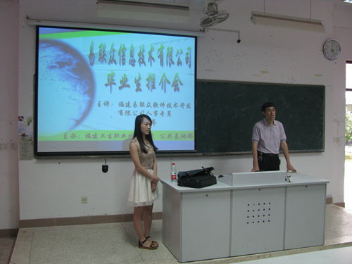 2013年6月25日下午,我院公共基礎部組織福建易聯(lián)眾軟件系統(tǒng)開發(fā)有限公司舉辦衛(wèi)生信息管理專業(yè)畢業(yè)生推介會。易聯(lián)眾人事專員蔡桂嬌介紹了本公司的概況,內容包括企業(yè)文化、硬件產品介紹、軟件系統(tǒng)完善,以及公司招聘信息等,同時這也為本屆畢業(yè)生提供了更多的就業(yè)信息。(藥學系 公共基礎部)