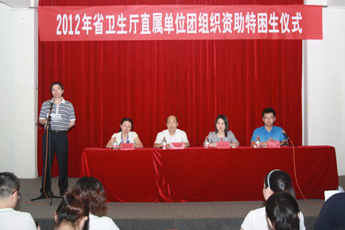 6月14日下午,2012年省衛(wèi)生廳直屬單位團(tuán)組織資助特困生儀式在我院明湖師生活動(dòng)中心隆重舉行。衛(wèi)生廳直屬單位各團(tuán)組織的代表和受資助學(xué)生參加了儀式。院黨委陳雄副書記、省衛(wèi)生廳團(tuán)委陳曉芩書記、院學(xué)工處黃銘珊處長、院團(tuán)委宋維副書記出席。