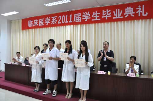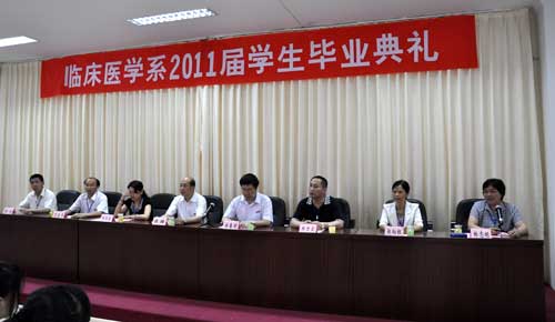 6月3日下午,我院臨床醫(yī)學(xué)系隆重舉行2011屆畢業(yè)典禮。本屆畢業(yè)生包括臨床醫(yī)學(xué)三年專和口腔醫(yī)學(xué)技術(shù)五年專共128人,他們是臨床醫(yī)學(xué)系首屆畢業(yè)生,受到院系各級(jí)領(lǐng)導(dǎo)的重視,學(xué)院林春明院長(zhǎng)、陳雄副書(shū)記、辦公室鄭力宏主任、教務(wù)處朱扶蓉副處長(zhǎng)、臨床醫(yī)學(xué)系鄭向紅常務(wù)副主任、林志明副主任、蘇愛(ài)華副書(shū)記及有關(guān)老師出席了典禮。畢業(yè)典禮由林志明副主任主持 。