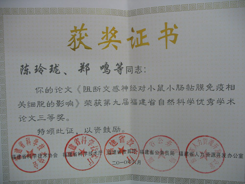 我院陳玲瓏?yán)蠋煹恼撐摹蹲钄嘟桓猩窠?jīng)對小鼠小腸黏膜免疫相關(guān)細(xì)胞的影響》榮獲第九屆福建省自然科學(xué)優(yōu)秀學(xué)術(shù)論文三等獎。(科研處)
