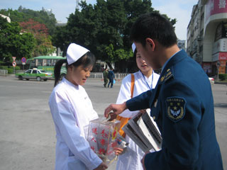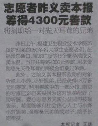 2009年4月11日,05級護理五年專160名義工身穿護士服,手捧福州紅十字會募捐箱,在福州東街口、寶龍城市廣場、中亭街、五一廣場等15個繁華地段義賣《東南快報》。本次義賣活動共賣出《東南快報》2500份,籌得善款4299.8元。善款將全部用于資助閩侯縣上街鎮(zhèn)馬排村的患先天性耳聾和精神分裂癥的金榕燊兄弟倆。 為了頌揚我系義工的熱心公益的人道精神,福州市紅十字會特為我系義工頒發(fā)了榮譽證書。2009年4月12日的《東南快報》A6版對此事進行了跟蹤報道。