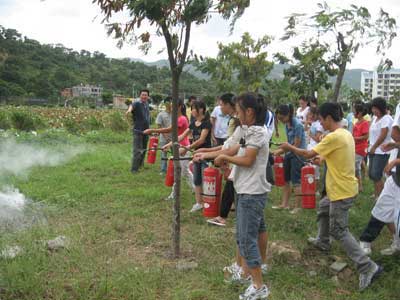首先黃世清老師細心地講解了滅火器材的使用方法、注意事項并且進行示范。然后武剛老師點燃事先備好的木柴,并親自指導新生使用滅火器滅火。我系新生按照事先安排,4人組成1個小分隊,每個小分隊成員在武剛老師和黃世清老師指導下都當了一回消防員,進行實戰(zhàn)滅火。