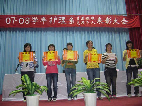 2008年10月14日下午4點(diǎn)于學(xué)術(shù)報(bào)告廳,護(hù)理系2007-2008學(xué)年先進(jìn)集體、先進(jìn)個(gè)人表彰大會(huì)在莊嚴(yán)的國(guó)歌聲中隆重召開。參加會(huì)議的有學(xué)生工作處黃銘珊副處長(zhǎng),護(hù)理系謝濤書記、劉珍紅副主任,辦公室副主任范飛老師,團(tuán)總支書記鐘奇志老師及各班輔導(dǎo)員和護(hù)理系全體獲得表彰的學(xué)生。