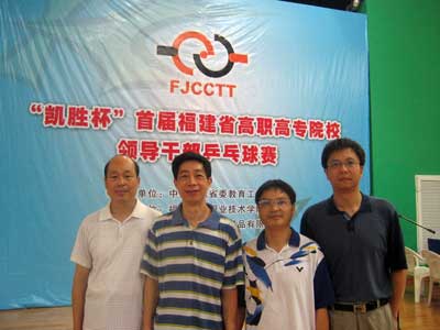 首屆全省高職高專院校領(lǐng)導(dǎo)干部乒乓球比賽,經(jīng)過兩天激烈爭奪于昨日(25日)降下帷幕。我院派出的陳雄、廖偉堅、黃開良三位領(lǐng)導(dǎo)干部在球場上奮力拼搏,揚長避短,不怕疲勞,機智果敢,戰(zhàn)勝了十八支來參戰(zhàn)的單位,最終贏得了團體賽冠軍。為我院爭得這次比賽的最高榮譽。