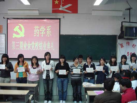 歐書(shū)記對(duì)本期業(yè)余黨校各方面的情況進(jìn)行總結(jié),對(duì)圓滿(mǎn)結(jié)業(yè)的同學(xué)們表示肯定并給予祝賀。并提出兩點(diǎn)希望:1、要繼續(xù)學(xué)習(xí)“三個(gè)代表”重要思想和新黨章,不斷提高自己的理論水平和政治素質(zhì)。2、要以實(shí)際行動(dòng)創(chuàng)造條件加入黨組織,首先要做一名合格的學(xué)生,在學(xué)習(xí)、工作中起模范作用。 第三期業(yè)余黨校結(jié)業(yè)典禮在國(guó)際歌聲中圓滿(mǎn)結(jié)束。(藥學(xué)系)